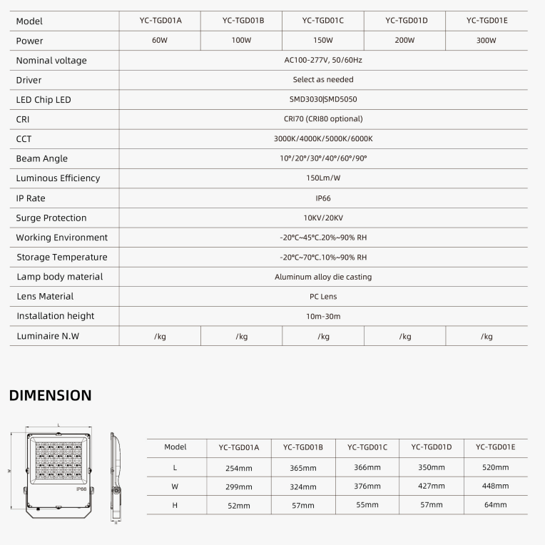 | YC-TGD01-50W | 358*294*52 | 50 វ៉ | តួអាលុយមីញ៉ូម, កញ្ចក់, ដង្កៀប, វីស 304, PCB, កញ្ចក់។ |