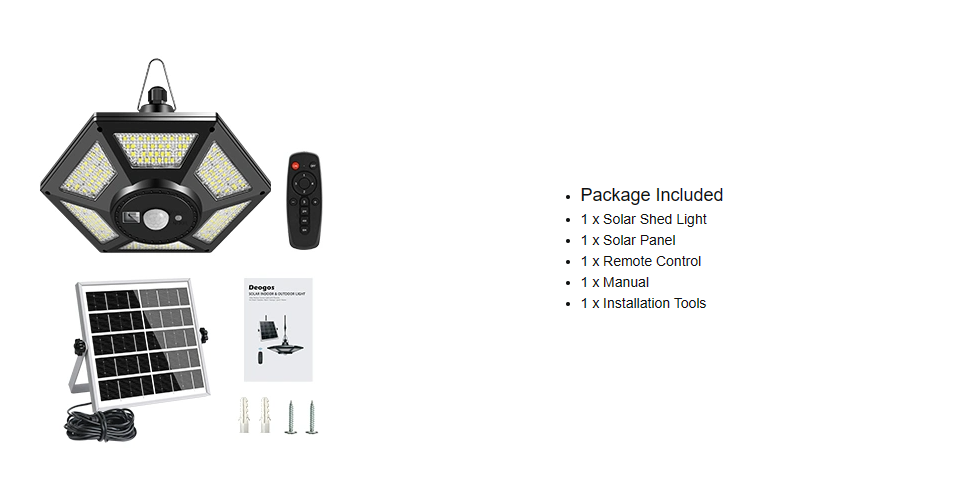 | សមាសធាតុរួមបញ្ចូល | បន្ទះស្រូបពន្លឺព្រះអាទិត្យ ការបញ្ជាពីចម្ងាយ ការម៉ោនផ្នែករឹង ឧបករណ៍បំភ្លឺ |