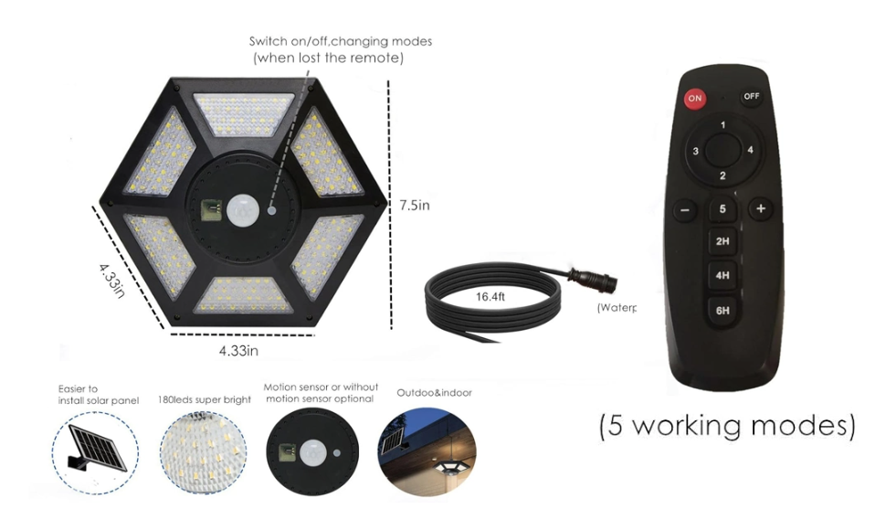ការបញ្ជាពីចម្ងាយ: 9.8-16.4ft នៅក្រោមពន្លឺ, មុំឧបករណ៍ចាប់សញ្ញា: 360 ដឺក្រេ, កម្រិតការពារទឹក IP65 ។